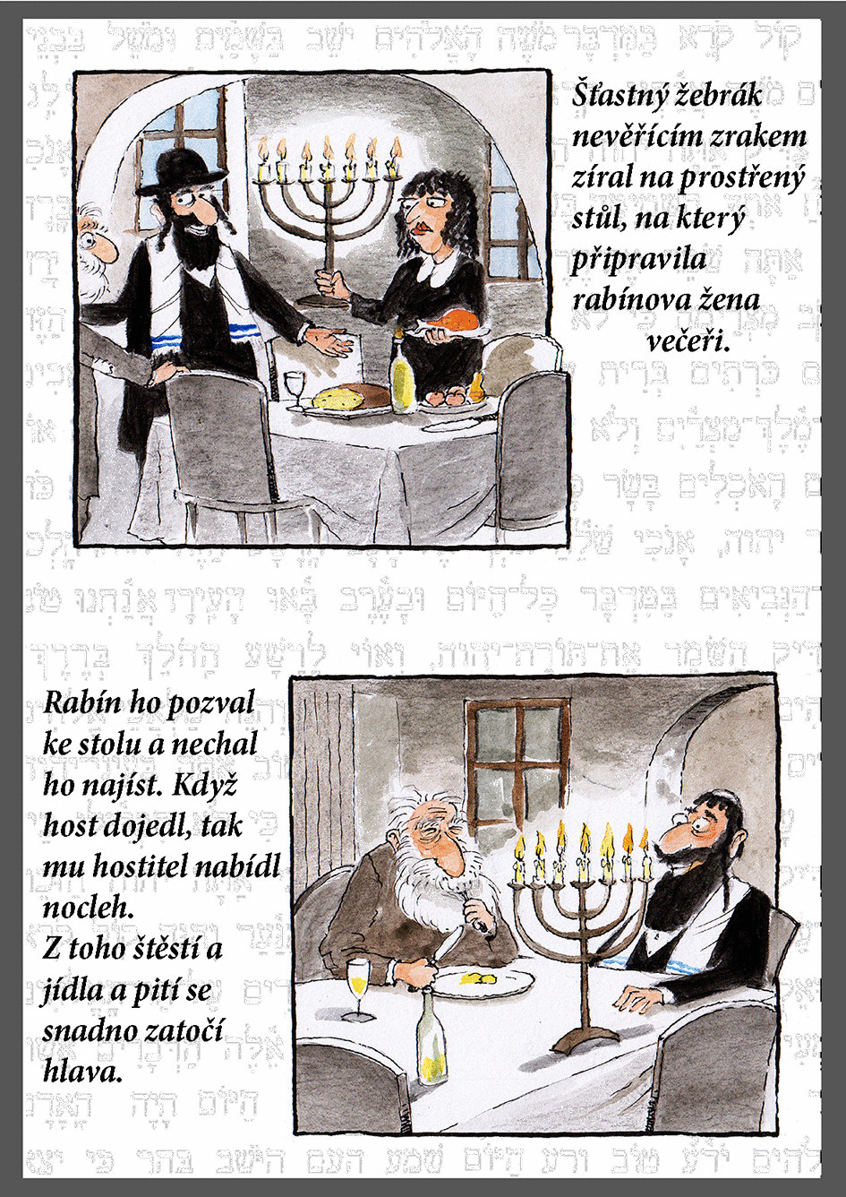 Takto vypadalo moje zadání: ŽidovskáV Mikulově žil velmi štědrý rabín. Kdo u jeho dveří zaklepal, ten dostal najíst, napít a mohl se v jeho domě vyspat. Jednou přišel velmi zubožený muž. Rabín ho pohostil a ráno mu dal ještě prsten. Když to jeho žena slyšela, začala nadávat svému muži: „Víš, jak je ten prsten vzácný? Za něj bychom si mohli koupit dům.” Muž se rozběhl za žebrákem a pravil: „Žena mi právě řekla, že ten prsten, co jsem ti dal, je velmi vzácný. Tudíž, se nenech ošidit!” Nejspíš byla předlohou židovská anekdota a ty miluju. Myslím, že nejsem sám. A protože jsem vás na stránkách Balad krmil samými tragickými příběhy, mordy, duchové, hroby atd., tak jsem vytvořil v mém podání a mým stylem tento příběh. Vše je úsměvné a ještě je nakonec poučení o nezištnosti. Co ještě víc… Aktualizace:Mému Ajťákovi se provedení nezdálo a namítal, že výsledek je sice po stránce obrázků v pořádku, ale text je špatně čitelný Takže dodal upravenou verzi, kterou jsem akcepoval, ale na konci balady ponechávám ukázku původni originál - pro srovnání. Balady Wolker - objevování po letech • Balada z nemocnice • Balada o namořníkovi • Balada o očích topičových Bezruč - Malý medailon • Slezské písně - skici Židovská balada Návštěvní kniha |