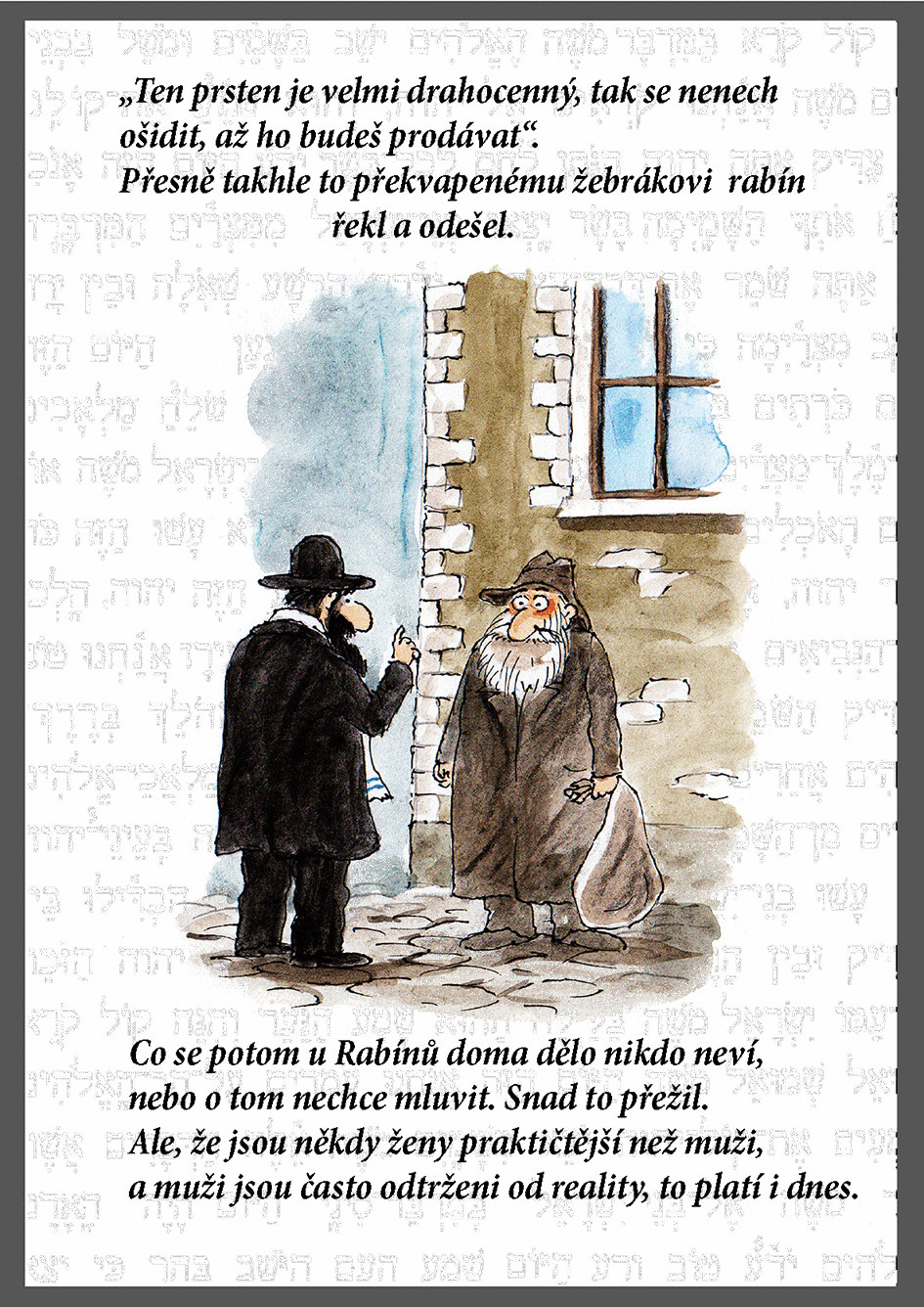 Takto vypadalo moje zadání: ŽidovskáV Mikulově žil velmi štědrý rabín. Kdo u jeho dveří zaklepal, ten dostal najíst, napít a mohl se v jeho domě vyspat. Jednou přišel velmi zubožený muž. Rabín ho pohostil a ráno mu dal ještě prsten. Když to jeho žena slyšela, začala nadávat svému muži: „Víš, jak je ten prsten vzácný? Za něj bychom si mohli koupit dům.” Muž se rozběhl za žebrákem a pravil: „Žena mi právě řekla, že ten prsten, co jsem ti dal, je velmi vzácný. Tudíž, se nenech ošidit!” Nejspíš byla předlohou židovská anekdota a ty miluju. Myslím, že nejsem sám. A protože jsem vás na stránkách Balad krmil samými tragickými příběhy, mordy, duchové, hroby atd., tak jsem vytvořil v mém podání a mým stylem tento příběh. Vše je úsměvné a ještě je nakonec poučení o nezištnosti. Co ještě víc… Aktualizace:Mému Ajťákovi se provedení nezdálo a namítal, že výsledek je sice po stránce obrázků v pořádku, ale text je špatně čitelný Takže dodal upravenou verzi, kterou jsem akcepoval, ale na konci balady ponechávám ukázku původni originál - pro srovnání. Balady Wolker - objevování po letech • Balada z nemocnice • Balada o namořníkovi • Balada o očích topičových Bezruč - Malý medailon • Slezské písně - skici Židovská balada Návštěvní kniha |